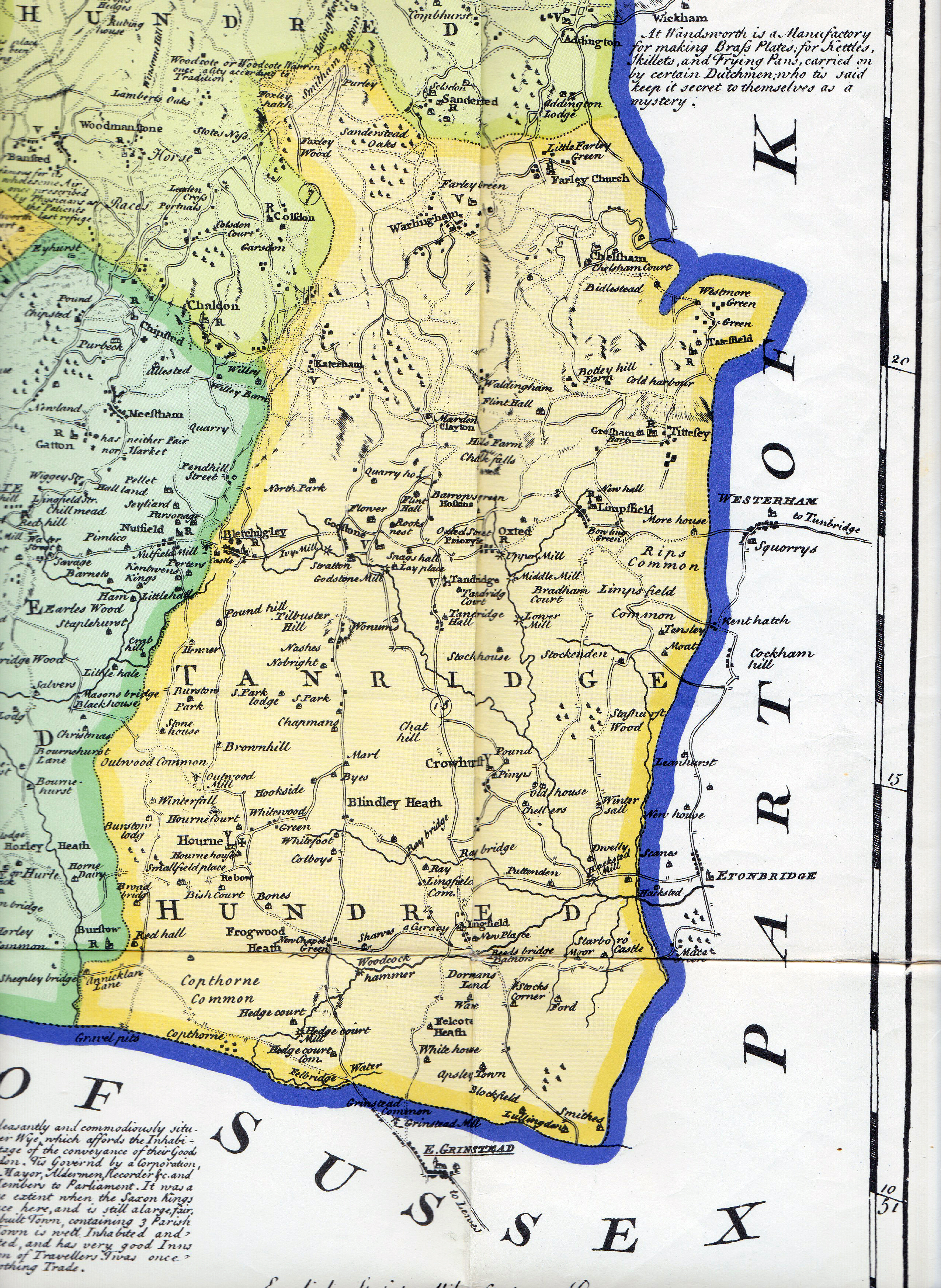 This is a thumbnail section of the Tandridge Hundred. It is one part of the map of Surrey which was engraved by Emmanuel Bowen, Geographer to King George III. Click on the thumbnail to see a large version. It is very large.
